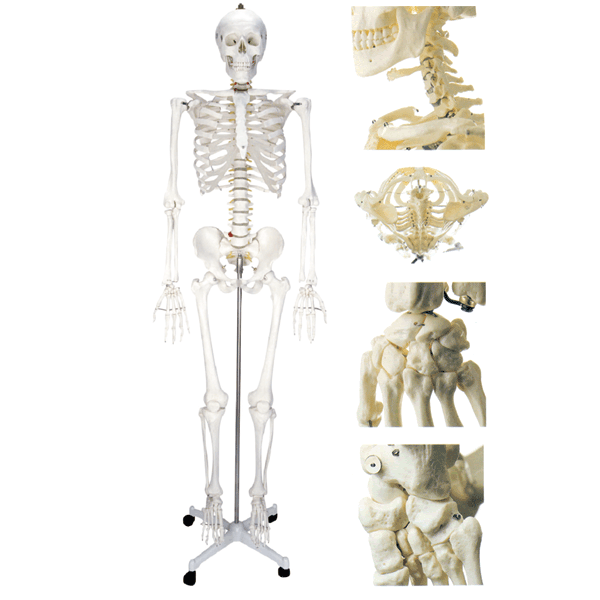 本模型示男性成人骨骼,串制成正常直立姿勢(shì),四肢大的關(guān)節(jié)部分可活動(dòng).