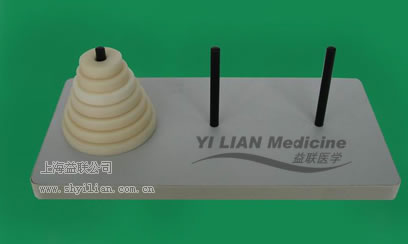 河內(nèi)塔由七個(gè)不同直徑的中孔圓盤與三根固定在底板上的直立小柱組成, 圓盤從大