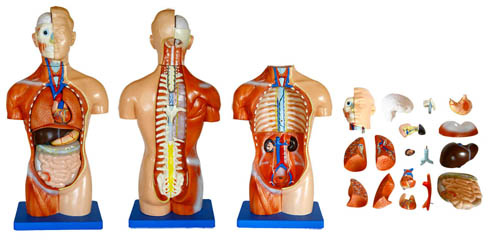 這是無性軀干模型分成18件:軀干,頭,腦,氣管,食管和主動脈,橫隔膜,肺(4件),心臟(2件),胃,肝,腎,胰和脾,腸,脊椎神經(jīng)。脊椎露在外面。用PVC制成,安放于塑料座上。尺寸:42CM。