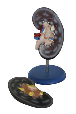 本模型適用于中等學(xué)校講解人體解剖有關(guān)泌尿器官課程時作直觀教具用。右腎作額狀切面,示腎門、腎血管、輸尿管和腎盂、腎實質(zhì)分髓質(zhì)及皮質(zhì)、錐體、乳頭等。用PVC制成,安放于塑料座上。本模型放大2倍。尺寸: 20x10x7CM。