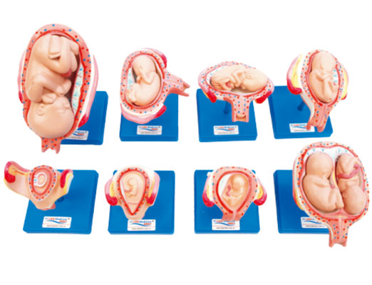 功能特點:該模型由妊娠胚胎發(fā)育過程一、二、三、四、五、六、七個月胚胎和五個月雙胞胎等8個模型組成,期中四、五、六、七個月胚胎和五個月雙胞胎模型胎兒可以取出,并顯示子宮、陰道、胎兒、臍帶、胎盤、羊膜腔以及卵巢、輸卵管等結(jié)構(gòu)。