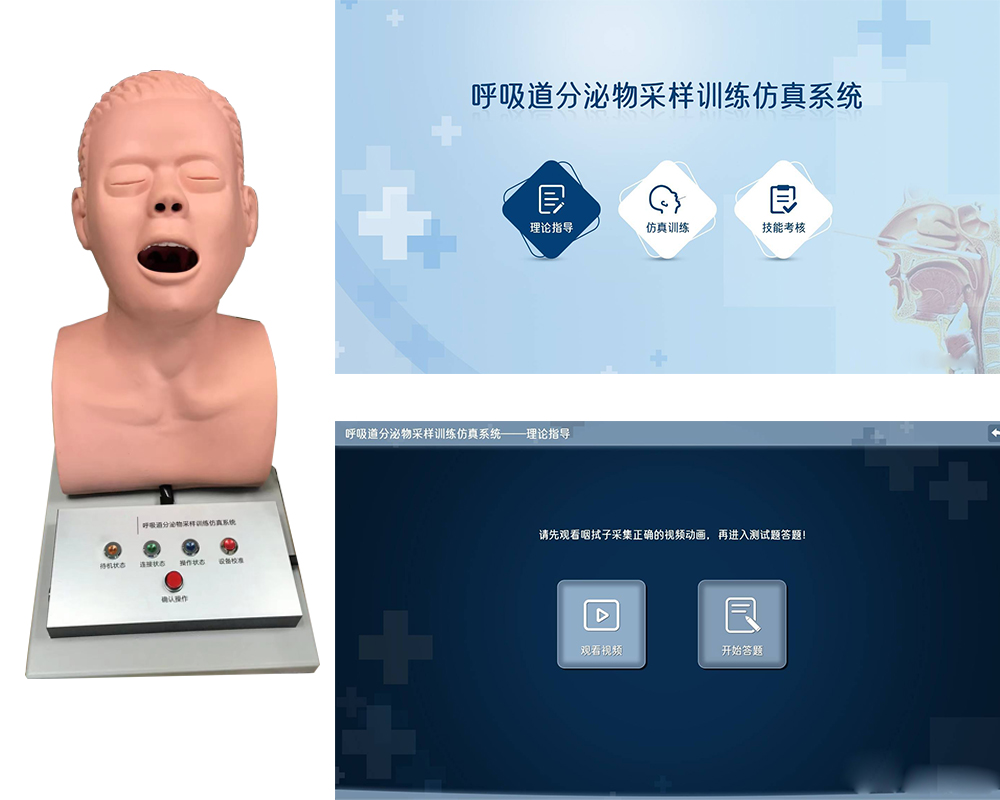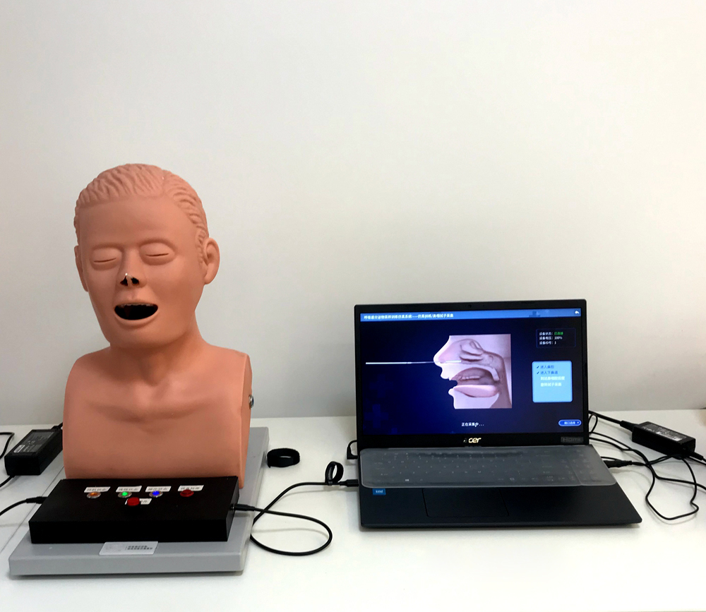 呼吸道分泌物采集訓(xùn)練仿真系統(tǒng),針對(duì)鼻咽和口咽拭子分泌物的采集訓(xùn)練而設(shè)計(jì),系統(tǒng)分為硬件及軟件部分,在鼻咽及口咽相關(guān)位置設(shè)置傳感器,通過(guò)真實(shí)的鼻拭子或咽拭子在呼吸道分泌物采集模型上進(jìn)行訓(xùn)練,按照采集的標(biāo)準(zhǔn)流程,可以對(duì)操作過(guò)程中的路徑、位置等信息進(jìn)行采集,并反應(yīng)到PC端的模型上,形象化的展示拭子在采集過(guò)程中所處的解剖位置以及采集的部位是否正確,手感真實(shí),可用于培訓(xùn)及考核。