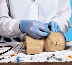 The temporal vein of the Life/form® Pediatric Head is easily accessible for IV infusions. Practice in the jugular vein is equally realistic. The neck is made of soft, flexible foam to provide a realistic feel of palpation and puncture. Life/form® Pediatric Head includes a Life/form® Head with skin and veins, fluid supply bag, two different gauge winged infusion needles, 1 pint Life/form® blood, teaching guide, and hard carrying case. One-year warranty.