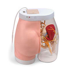 This high-tech medical model with realistic skin is perfect for teaching proper injection techniques and how to avoid nerves and veins. The see-through right side of the model shows internal structure including bones, muscles, nerves and veins. Correct intramuscular injection sites can be palpated. A green light indicates correct injection technique and positioning - a buzzer and flashing red light warn students if they have gone too deep or needle position is incorrect. Dimensions: 15" H x 13-3/4" W x 8-1/2" D. One-year warranty.